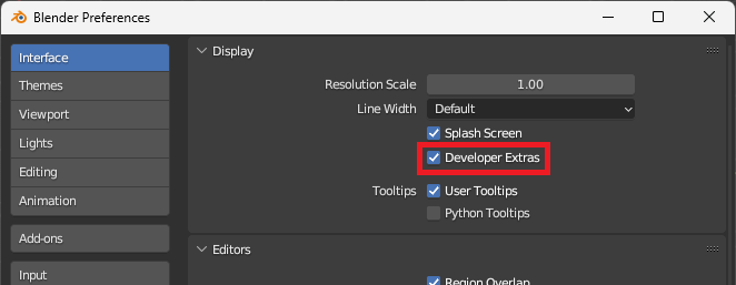 - Edit > Preferences > Interface > Display > Developer Extras : Checked