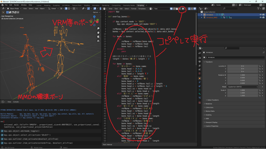 Unity Humanoid や VRM のボーン構造から、MMD の標準ボーンの構造に変更したい時がある。ボーンの名前を一致させた後に、対象のボーンを 2 つ選択して、以下のスクリプトを実行する。