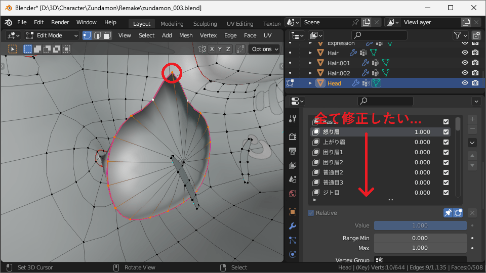 シェイプキーを複製していたせいで、全てのシェイプキーを修正しなくてはならないような場合がある。