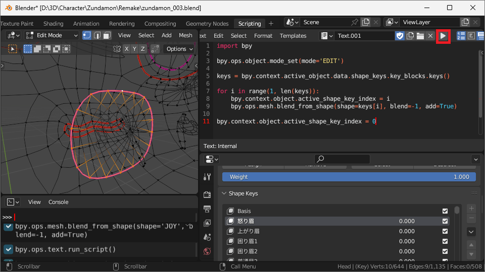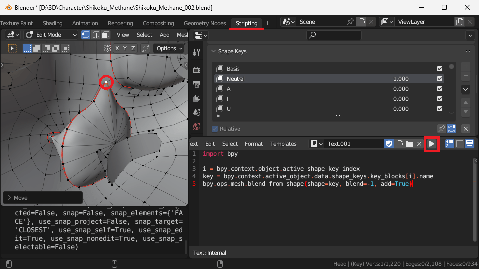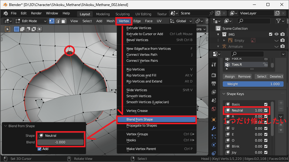 シェイプキーを1つだけ修正するなら手動でも問題ないが、複数あると面倒なので、以下の手順を利用する。