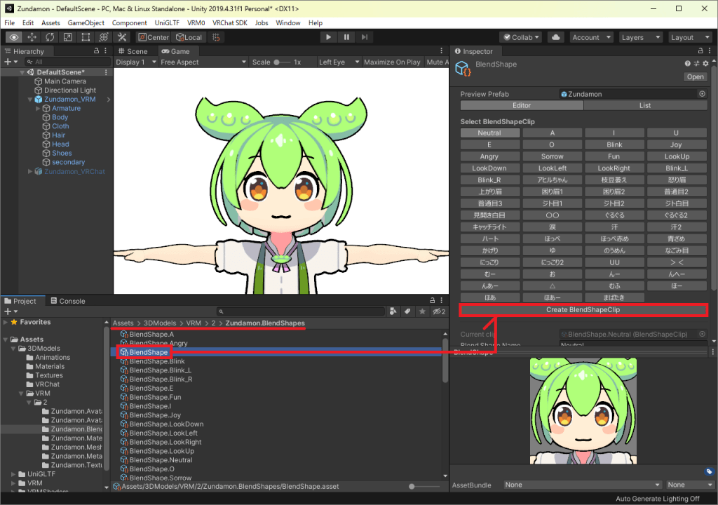 • Assets > 3DModels > VRM > 2 > Zundamon.BlendShapes > BlendShape をクリックする