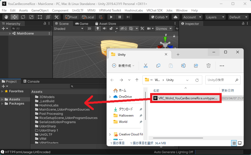- 受け取った Unity パッケージを Assets フォルダにドラッグ&ドロップする。
