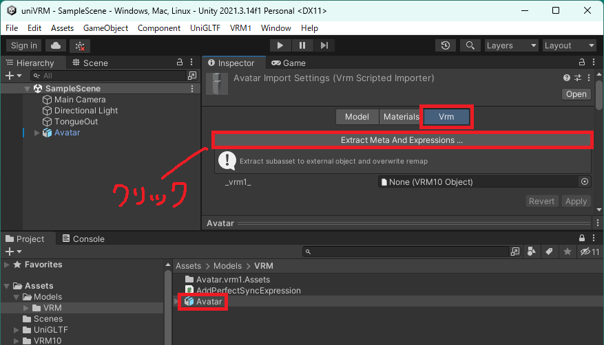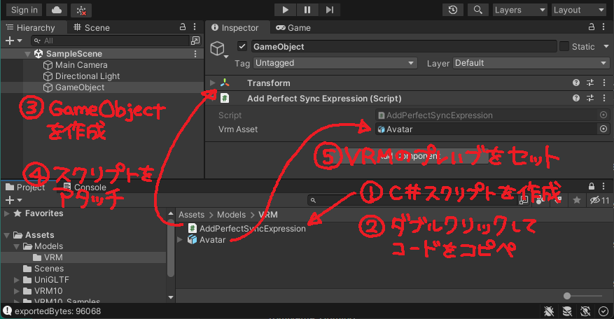 Unity にて、3D モデルを Export VRM した後、以下の手順を実施する。